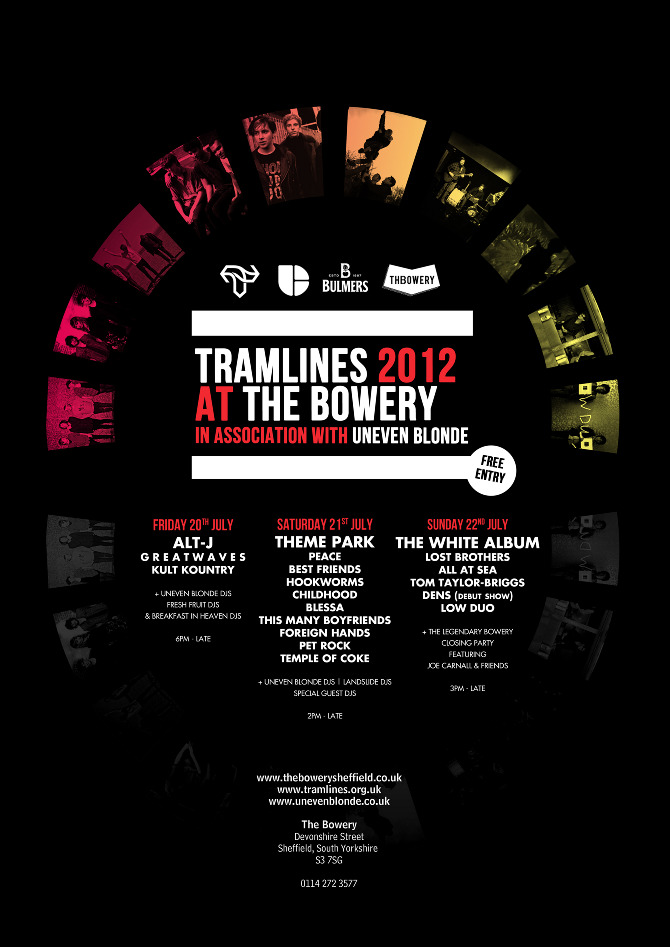 The poster for tramlines is very basic in terms of colour scene however the images are relevant but are simple to keep a younger audience engaged for the graphic aren't too daunting and complicated. it dosent have a header or banner to display what it is however it does contain the logo to brand who the posters for . The information is very brief with strap lines to get the reader engaged then if they are interested they will search for more info. The use of sans serif fonts fits in with the smooth look of the image in the background to the advertisement looks uniform a professional. the graphic follow roughly the house style usually white black and either yellow or red. the leading of the text is the same making it uniform and inline. The logo is clearly shown at the top for quick recognition of the tramlines brand so the viewer is aware that it is about tramlines without reading any of the text.